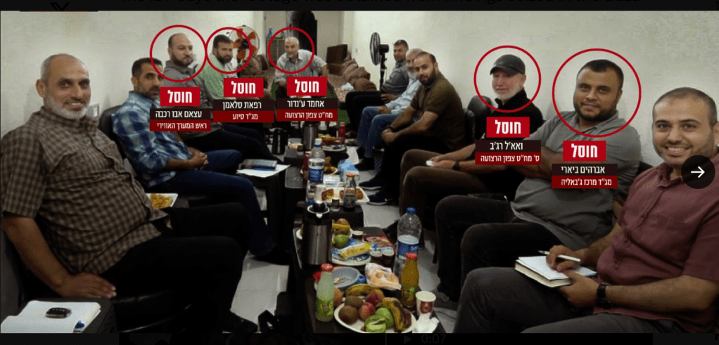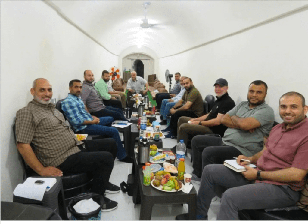 Na ja, bequem sieht vielleicht etwas anders aus, aber zur Not kann man sich offensichtlich recht gut in den Tunnelanlagen verstecken. Saubere Wände, sauberer Boden, Kissen zum Anlehnen und am Ende des Raumes sogar Sofas zum Ausruhen. Auf den Tischen frisches Obst und Kalt- sowie Heiss-Getränke. Gutes Licht und sogar Ventilatoren… Von den auf dem Bild anwesenden Hamas-Anführer leben fünf nicht mehr. Das Bild wurde bei der Durchsuchung eines Hauses im Gazastreifen gefunden.