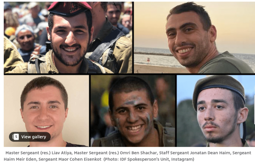Gestern am Nachmittag musste die IDF erneut den Verlust von fünf Soldaten bekanntgeben. Master Sgt. (res.) Liav Atiya, 25, Master Sgt. (res.) Omri Ben Shachar, 25, Staff Sgt. Jonathan Dean Jr. Haim, 35, Sgt. Maor Cohen Eisenkot, 19, und Staff. Sgt. Haim Meier Edan, 20, s’’l. Edan wurde am 7. Oktober verletzt und verlor gestern den Kampf um sein Leben. Weitere zwölf Soldaten wurden bei Kämpfen im südlichen Gazastreifen schwer verletzt.