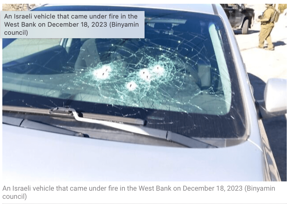 Bei einem Anschlag mit einer Schusswaffe wurde in Samaria ein Auto angegriffen. Eine Frau wurde mittelschwer verletzt, ihr Mann und das sechs Wochen alte Baby blieben unverletzt. Ihrem Mann gelang es, mit seiner Dienstwaffe die Angreifer zu vertreiben und so Schlimmeres zu verhindern. Trotz ihrer Verletzungen gelang es ihrem Mann, einem Reservisten, der auf einem Kurzurlaub daheim war, einen Vorort von Jerusalem zu erreichen, wo sie umgehend vom Magen David Adom erstbehandelt und dann in ein Krankenhaus eingeliefert wurde. Die Suche nach den Attentätern ist noch im Gange