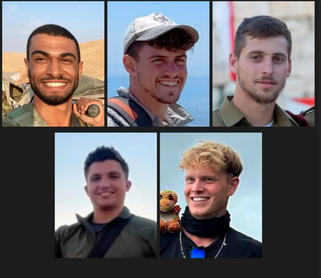 Staff Sgt. Boris Dunavetski, 21, Sgt. First Class Urija Bayer, 20, Sgt. First Class Liav Aloush, 21, Master Sgt. (res.) Etan Naeh, 26, Master Sgt. (res.) Tal Filiba, 23, und Sgt. First Class (res.) Lidor Yosef Karavani, 23, s’’l.
