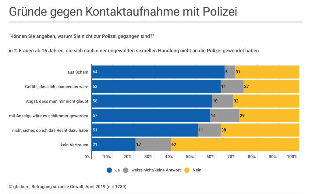 Schon nach den ersten Gesprächen und der Sichtung der ersten Unterlagen wird ihr klar, dass hier einige verantwortliche Stellen zusammenarbeiten müssen, um eines sicherzustellen: Der Schutz der Opfer und deren Angehörigen muss an oberster Stelle stehen. Frauen in aller Welt erleben es immer wieder, dass sie, wenn sie den schweren Schritt tun, polizeilich anzuzeigen, dass sie Opfer einer Vergewaltigung oder sonstiger Gewalt gegen sie wurden, oft auf gänzlich unempathische Menschen treffen. Allzu oft werden sie nicht ernstgenommen, belächelt, ja sogar einer Mitschuld bezichtigt. Ein Grund, warum die Dunkelziffer der Gewaltverbrechen gegen Frauen immer noch so hoch ist. Es ist richtig und wichtig, dass die Befragungen heute nur mehr durch weibliche Beamte durchgeführt werden dürfen. Eine Befragung in der Schweiz aus dem Jahr 2019 zeigt erschreckende Ergebnisse. Von den 4.495 befragten Frauen ab 16 Jahren hatten 1.239 gegen sie gerichtete sexuelle Gewalt erlebt. Warum sie diese nicht zur Anzeige brachten, zeigt die Tabelle: