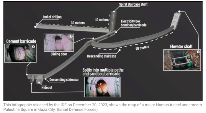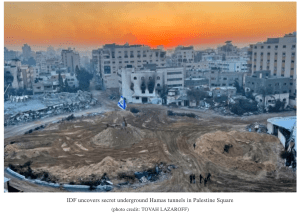 Unter dem Palestine Square, einst das lebendige Zentrum von Gaza City, graben derzeit Soldaten das grösste bisher entdeckte Tunnel-Netzwerk aus. Hier im Zentrum von Gaza haben sich die Anführer der Hamas Terror-Organisation eingegraben. In dem beliebten und teuren Wohnquartier lebten ihre Familienangehörigen oberhalb in luxuriösen Appartements und Penthäusern. Unterhalb lebten die Anführer in der ‘unterirdischen Terrorstadt’. Ein aufgefundener Rollstuhl lässt vermuten, dass sich auch die beiden meistgesuchten Terroristen, Muhammad Seif (siehe mein Bericht von gestern) und Yahya Sinwar immer wieder länger dort aufgehalten haben. Wohnungen, Büros, mehrstöckige Tunnelanlagen, sogar ein Lift machten das unterirdische Leben so angenehm wie möglich.