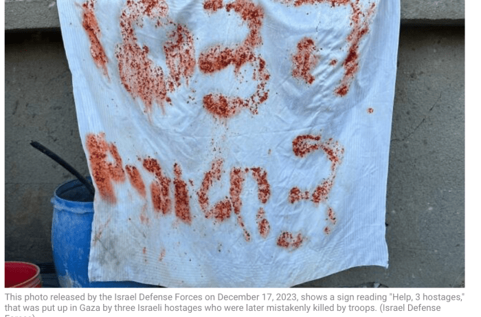 Die drei Geiseln, die bei einem Vorfall, der gerade von der IDF untersucht wird, am 15. Dezember ihr Leben verloren, sind offensichtlich einer tragischen Verkettung von Umständen zum Opfer gefallen. Bereits einige Tage vorher hatten die Soldaten einen Hund eingesetzt, um zu erspüren, ob sich im Gebäude Menschen befanden. Die versteckten Terroristen schossen auf den Hund und wurden daraufhin von der IDF eliminiert. Es gelang den Soldaten zunächst nicht, den Hund zu befreien, auch nachdem er seinen Wunden erlag, funktionierte seine Body-Cam noch einige Zeit. Sie nahm Bilder von den flüchtenden Geiseln auf. Es gelang der IDF nicht, tiefer in das Haus einzudringen, den Hund zu bergen und seine Kamera-Aufnahmen auszuwerten. Dies gelang erst am 18., drei Tage nach dem schrecklichen Vorfall. Die Soldaten hatten wohl die Hilferufe in Hebräisch gehört, waren aber sicher, es handele sich um eine Falle. Die Analyse ergab, dass sich zwischen der IDF und den Geiseln, die sich jetzt versteckten, jedoch später erschossen wurden, etwa ein km befand. Das, was von den Geiseln als Hoffnung, dass sie befreit würden, gewertet wurde, erwies sich als zweiter Fehler. Die IDF bewertete mit Lebensmittelresten aufgemalten ‘SOS’ und ‘Hilfe, 3 Geiseln’ fälschlicherweise ebenfalls als Falle. Es war Vorschrift, sich von derartig gezeichneten Häusern fernzuhalten. Einer der Scharfschützen, die die tödlichen Schüsse abgaben, hatte zu Beginn seiner Schicht die Information erhalten «Dieses Gebiet ist Kampfgebiet, Feuer darf jederzeit auf alles, was verdächtig ist eröffnet werden.»Die IDF war nicht darauf vorbereitet, Geiseln zu sehen, die sich frei und unbewacht in der Region bewegen. Generalstabschef Herzi Halevi unterrichtete nochmal seine Soldaten: «Wenn ihr Menschen sehr, die mit blossem Oberkörper die Hände über den Kopf halten, stoppt und nehmt euch zwei Sekunden. Was tut ihr, wenn Gazaner mit einer weissen Fahne kommen und sich ergeben. Erschiessen wir sie? NEIN! Wir schiessen nicht, wir nehmen sie gefangen.»