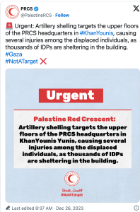 Der Rote Halbmond reklamiert, dass das Gebäude, in welchem seine Büros in Khan Younis untergebracht sind, von der IDF beschossen wird. In einer Meldung heisst es, dass die IDF die Obergeschosse des Hauses, in denen ‘Tausende’ von Flüchtlingen Schutz gesucht haben, beschossen werden, und dass es dort einige Verletzte gibt. Tausende von Flüchtlingen? Eine eklatante Lüge!