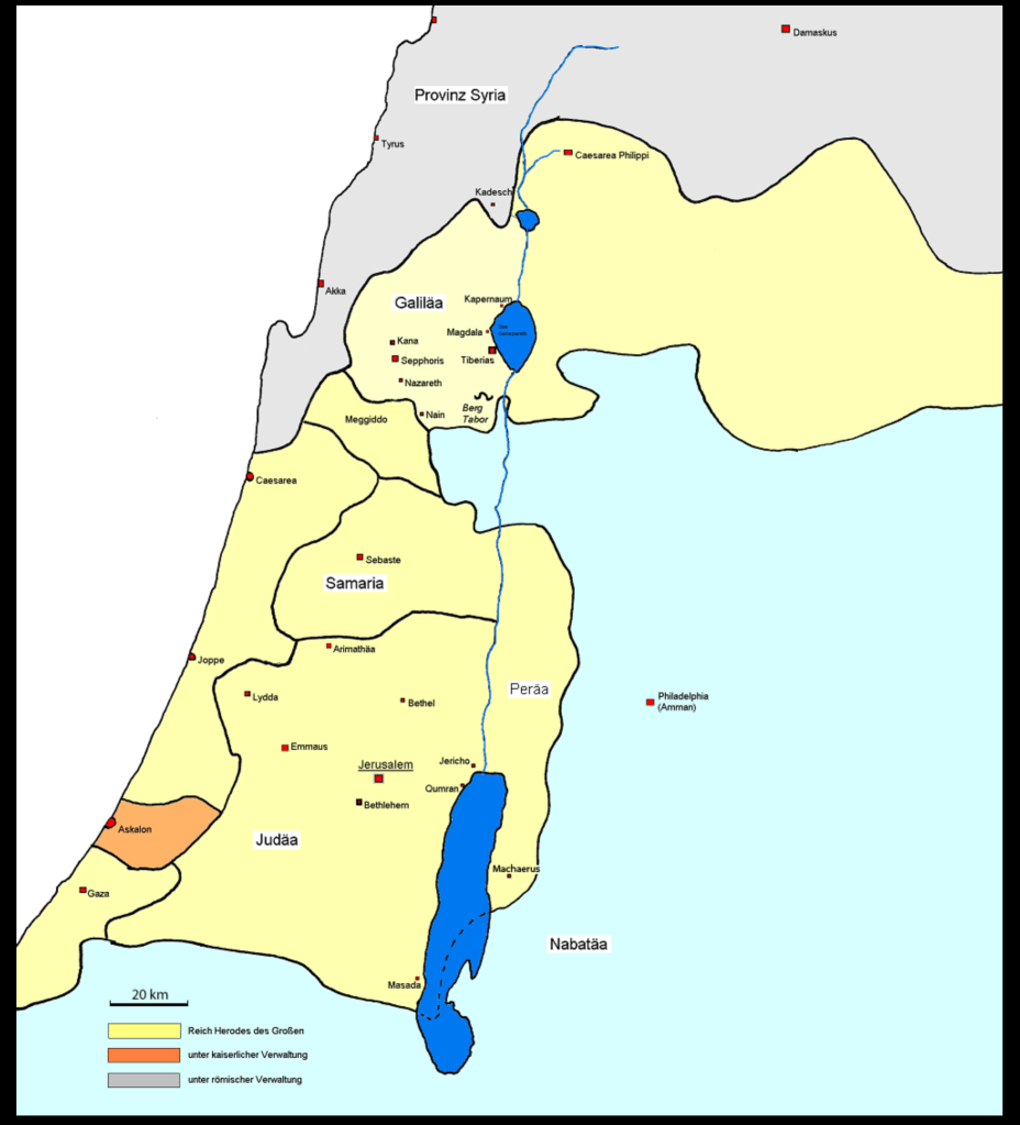 Bethlehem gehört zum Imperium Romanum, das Judäa nicht, wie das benachbarte Syrien zu einer Provinz degradiert hatte, sondern zu einem ‘Klientelstaat’ mit Namen Juda ernannt hatte. Die Könige wurden als ‘Freunde und Bundesgenossen’ eingesetzt, konnten jedoch nicht selbstständig entscheiden und regieren. Am bekanntesten war König Herodes (73 bis 4 BCE) der Grosse, unter dessen Herrschaft der zweite Tempel entstand, der im Jahr 70 CE zerstört wurde und die meisten Juden in die Diaspora vertrieb. Bisher taucht noch nirgendwo der Begriff einer palästinensischen Ethnie auf. Das römische Palästina bestand von 63 BCE bis 634 CE.