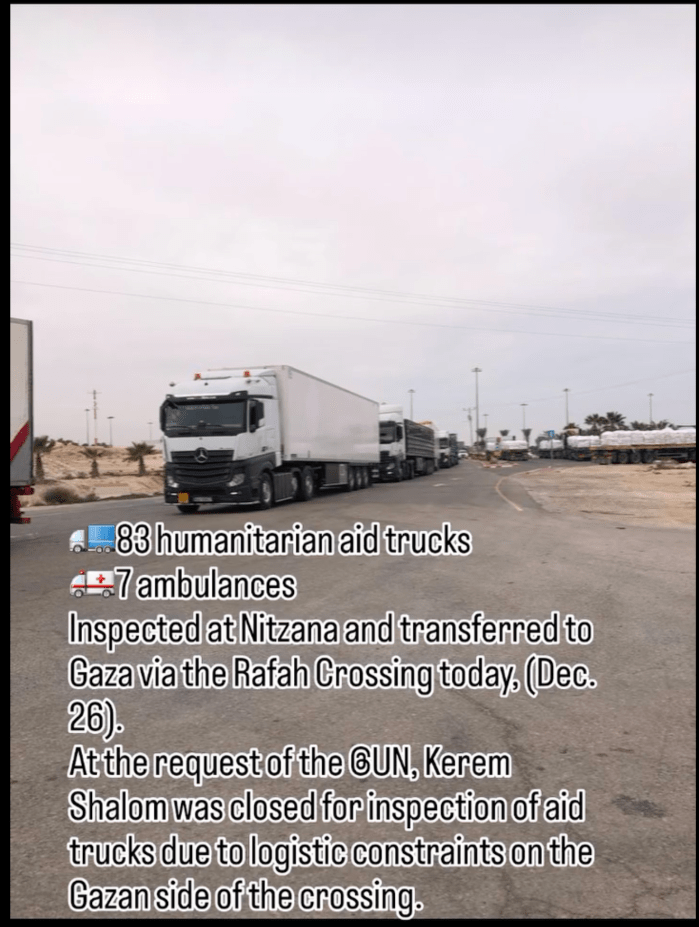 COGAT berichtete, dass gestern nur 83 LKWs mit humanitären Hilfsgütern und 7 Ambulanzen am Kontrollpunkt Nitzana abgefertigt worden sind. Warum kam es zu dieser geringen Zahl von Hilfslieferungen? Auf Antrag der UNO blieb der Warenübergang Kerem Shalom auf der Seite von Gaza geschlossen. Der Grund? Logistische Einschränkungen. Vorgestern hatten noch 412 LKWs Nitzana und 86 weitere Kerem Shalom passiert,