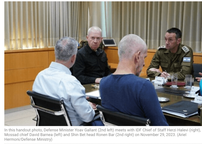 Zwar kann er seinem VM nicht verbieten, sich mit den höchsten militärischen Vertretern zu treffen, der Mossad und Shin Bet unterstehen jedoch direkt dem Büro des PM. Gallant hat zweimal den Chef des Mossad eingeladen, als es um Themen im Zusammenhang mit den Geiseln ging, wurde aber von Netanyahu aufgefordert, diese Treffen wieder abzusagen.