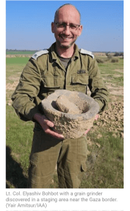 Die gute Nachricht des Tages: Bereits zum zweiten Mal innerhalb der vergangenen Wochen haben Reservisten auf Patrouillengängen entlang der Grenze zu Gaza einen bedeutenden Fund gemacht. In diesem Fall war der glückliche Finder Lt. Col. (res.) Yair Amitsur, der im bürgerlichen Leben Archäologe ist. Derzeit leistet er Dienst im Home Front Kommando. Er entdeckte einen steinerneren Mörser, der zum Mahlen von Getreide gebraucht worden war. Entdeckt hat er das selten gut erhaltene Artefakt, als er mit Lt. Col. Elyashiv Bohobot, einem Divisions Rabbiner, seine Patrouille machte. Der Mörser, hergestellt aus Basalt, wiegt etwa 10 kg. Als Pistill wurde in der Antike normalerweise ein stabiles Holz gebraucht. «Basalt kennen wir aus dem Norden des Landes. Wir gehen also davon aus, dass der Mörser hierher gebracht wurde.» Das Fundstück wurde der Antiquitäten Behörde übergeben.