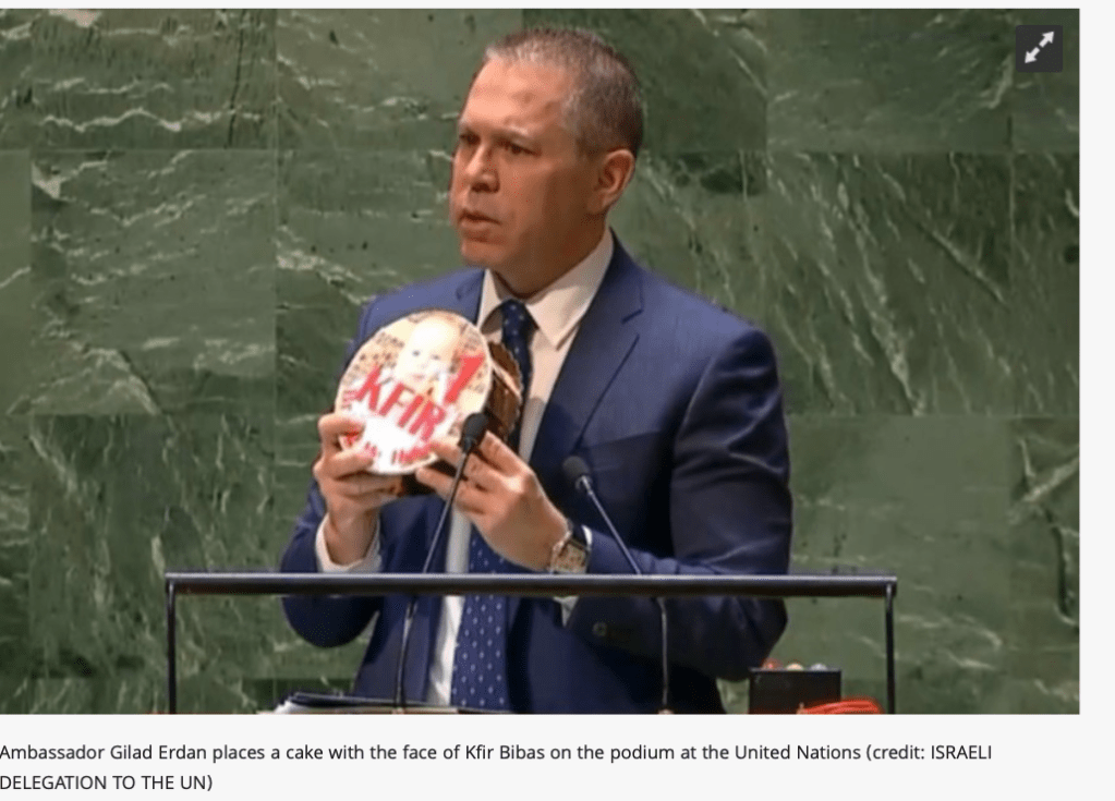 Baby Kfir, hat gestern in der Dunkelheit der Geiselhaft in Gaza seinen ersten Geburtstag erlebt. Es gab weder eine noch so kleine Torte mit einer Kerze noch ein neues Knuddeltier zum Spielen noch das Glück in den Augen der Eltern, wenn er seine ersten selbstständigen Schritte macht. Seine ersten Worte werden auch nicht Ima oder Aba sein, ich möchte mir gar nicht ausmalen, was er als Erstes versucht, klar auszusprechen! Baby Kfir, ich wünsche dir, dass du noch lebst und dass dein Bruder Ariel und deine Mutter dich beschützen können! Der UNO-Botschafter Israels, Gilad Erdan stellte einen symbolischen Kuchen auf das Rednerpult der UNO und bat darum, ihn dort bis zu Freilassung des Kindes stehen zu lassen.