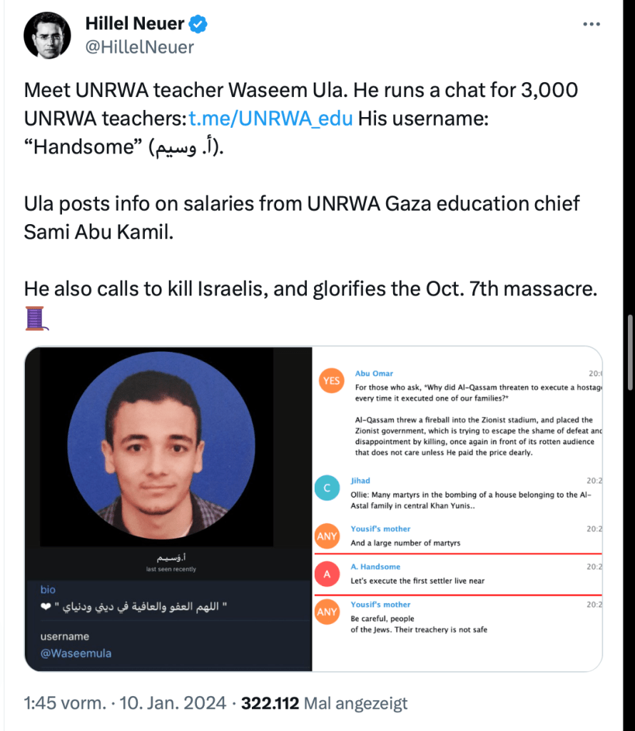 3.000 UNRWA-Lehrer, die auf Telegramm eine Gruppe haben, haben dort massenhaft Postings verbreitet, in denen sie die Massaker vom 7. Oktober loben und ihre Unterstützung ausdrücken. Geführt wird der Kanal von Waseem Ula, sein Nutzername ist «Handsome». In seinen Beiträgen ruft er dazu auf, Juden zu töten, er zeigt Sprengstoffgürtel, die die Aufschrift «Wait, sons of Judaism» tragen. Die Glorifizierung der Massaker begann bereits wenige Minuten, nachdem sie begonnen hatten. Mörder und Vergewaltiger werden als ‘Helden’ bezeichnet, die Ausbildung, die sie im Vorfeld der Massaker durchlaufen hatten, wird ausdrücklich gelobt. Waseem beschreibt den Terroristen Akran Abi Hasanen als «Qassami martyr,” “friend” & “brother.” Er betete auch für ihn, dass Allah ihn ohne Verzögerung in das Paradies einlassen solle. Auf der Webseite von Hillel Neuer finden sich noch weitere fürchterliche Beispiele. Bilder und Clips der Verschleppungen und Massenvergewaltigungen finden über Telegramm eine massenhafte Verbreitung im Netz.