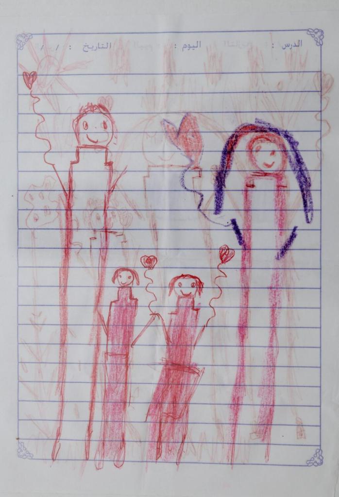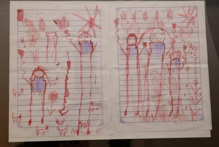 Emilia Aloni, 6, hat während ihrer grauenhaften Geiselhaft in Gaza mit den wenigen Dingen, die ihr zur Verfügung standen, eine eigene Welt geschaffen, wie sie sich vor ihren kindlich-optimistischen Augen zeigte. Auf drei Bildern, die sie nicht mitnehmen durfte, als sie aus der Geiselhaft freigelassen wurde, hielt sie ihre traumatischen Erlebnisse fest. Das erste Bild zeigt ihre Familie: Sharon, 33, David, 34, Emma, 3, und ihre Schwester Yuli, 3. Sharon und ihre Töchter wurden freigelassen, David befindet sich noch Geiselhaft. Daniela, ihre Mutter vermutet, dass Emilia durch viele Gespräche über ihre Schwester Sharon zu diesem Bild inspiriert wurde. Das zweite Bild zeigt drei Menschen, Elena und Sasha Trupanov und seine Verlobte Sapir Cohen. Das Bild zeigt die Hochzeit der beiden. Alle drei wurden aus der Geiselhaft entlassen, nur die Mutter von Elena, Irena, befindet sich noch in Gaza. Im dritten Bild hat sie Elena mit ihrem Mann Vitali, 50, s’’l, der am 7. Oktober in Nir Oz ermordet wurde, gezeichnet. Die beiden sind in dem Bild gemeinsam auf einer Reise. Emilia erhielt zwar einen ganzen Block, den sie mit Bildern füllte, aber nur zwei Stifte in den Farben Rosa und Lila. Der Block wurde später von einer anderen freigelassenen Geisel aus dem Versteck geschmuggelt.