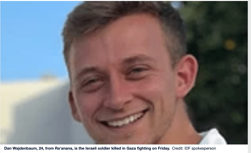 Erneut musste die IDF den Tod zweier Soldaten bekanntgeben. Mast. Sgt. (res.) Dan Wajdenbaum, 24, und Sgt. First Class (res.) Andu’alem Kabada, 21, s’’l, verloren ihr Leben bei Kämpfen im zentralen Gazastreifen. Drei Soldaten wurden bei unterschiedlichen Vorfällen verletzt. Fünf Soldaten wurden über Nacht bei Kämpfen an der libanesischen Grenze verletzt.