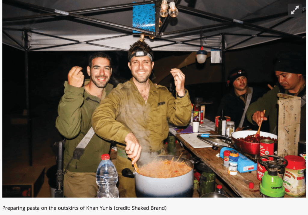Die gute Nachricht: First Sgt. (res.) Stav Netta – Chaim dient derzeit beim ersten Zug des 8111 Infanterie Bataillons im Gazastreifen. Er sorgt sich dort nicht nur darum, dass seine Männer in ihm einen verantwortungsbewussten Ansprechpartner haben, sondern auch, dass sie einen angenehm gefüllten Magen haben. Natürlich werden die Soldaten ausreichend verpflegt, aber die gelieferten Lebensmittel sind selten das, was man unter einer wohlschmeckenden Mahlzeit versteht. Warme Mahlzeiten gibt es nicht, alles ist einfach zu verspeisen. Die Nahrungsmittel sind zumeist Instant Riegel, Fläschchen und Beutel. Stav nutzt seine eigene Berufserfahrung als Koch, um auch aus dem Wenigen eine schmackhafte Mahlzeit zu zaubern und damit die Moral der Soldaten zu heben. In der letzten Woche verwandelte er die improvisierte ‘Bar zum Tunnelschacht’ in Kfar Younis in eine ‘Humuseria’. Dabei musste er improvisieren. Die Kichererbsen kochte er in aufgeschnittenen Wasserflaschen in Wasser und Soda auf einem Campingkocher. Nach zwei Stunden waren sie gar, er zerstampfte sie mit einer Ölflasche zusammen mit Knoblauch, Zwiebeln und Zitronenschale. Gewürzt wurde mit allem, was sich fand. Pitot, die Fladenbrote wurden auf dem Gasbrenner geröstet und fertig war ein perfektes, warmes Gericht. Salzgurken und Oliven dienten als Garnitur. Yoaz Hendel, 48, ehemaliger Kommunikationsminister aus der Oppositions-Partei ‘Neue Hoffnung’ (Gideon Sa’ar) dient in der gleichen Einheit und empfiehlt das improvisierte Restaurant auf das Wärmste. Stavs Einfallsreichtum sind nur dann Grenzen gesetzt, wenn er kein passendes Material findet. Er servierte den hungrigen Soldaten schon eine koschere Version von Spaghetti Carbonara und Sabih, ein irakisch-jüdisches Sandwich mit Auberginen, hartgekochtem Ei, Thunfisch und allen möglichen Salaten. Stav hat am ersten Shabbat nach dem 7. Oktober auch schon Challa, das traditionelle Shabbatbrot serviert. Damals war die Einheit abkommandiert, um den Kibbutz Kissufim zu schützen. Der Teig ging 12 Stunden und wurde in einem Ofen gebacken, der unbeschädigt in einem Hinterhof stand. Salz und Oregano, den er im Garten fand, dienten als Gewürze. Die Segenssprüche zum Shabbat liessen die Soldaten ein wenig zur Ruhe kommen.