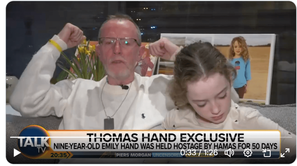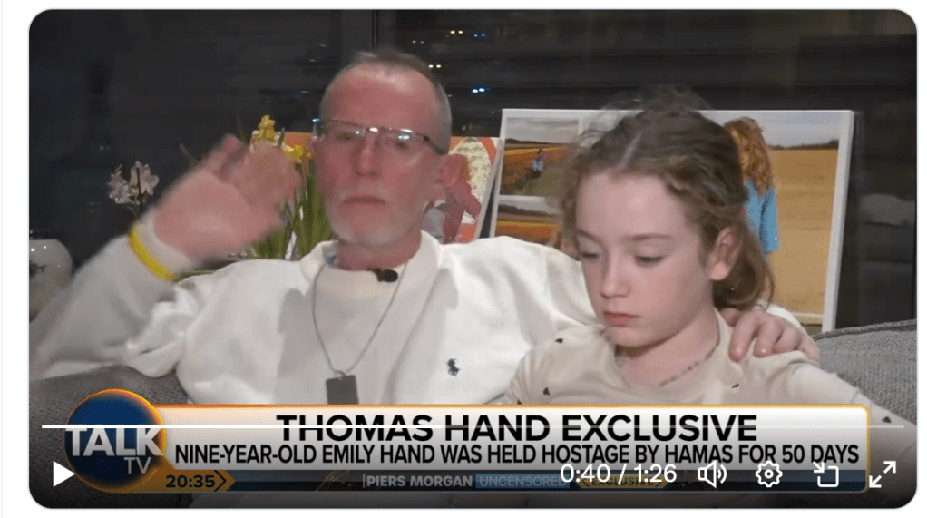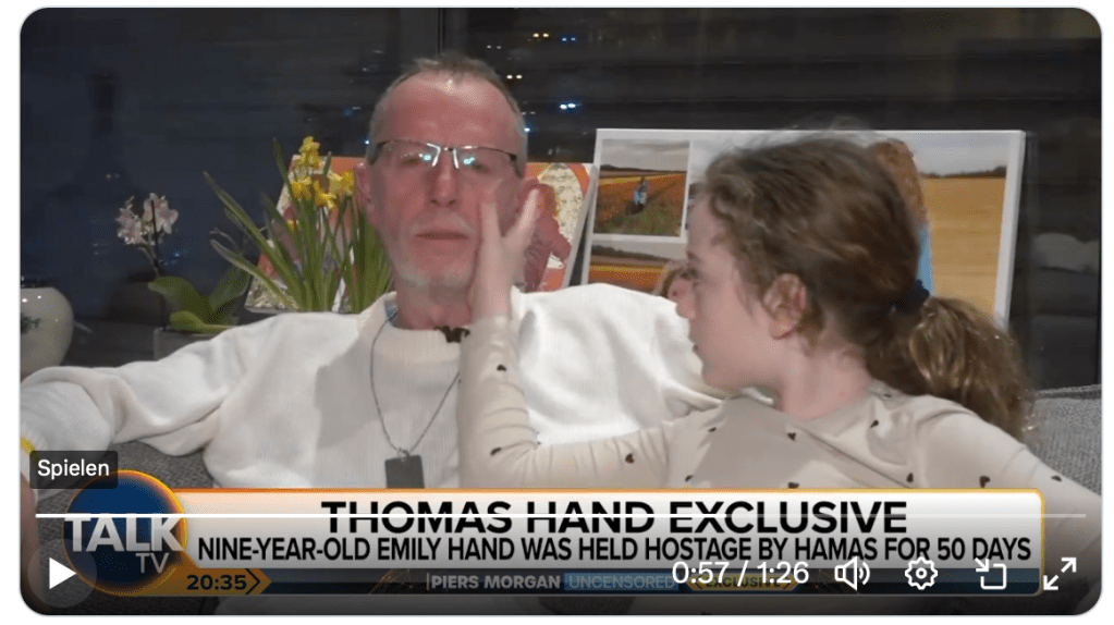 Thomas Hand, Vater der 9-Jahre alten Emily, die während 50 Tagen in Gaza festgehalten wurde, hat in einem Interview mit Piers Morgan, UK, eine heftige Anklage gegen Kritiker von Israel geführt. «Sie haben keine Ahnung! Wir leben jeden Tag damit, OK? Sie haben kein Recht, überhaupt mit mir zu sprechen. Seid ihr jemals in Israel gewesen, irgendjemand von euch, der sagt ‚das ist unverhältnismässig‘, irgendjemand von euch, der kommt, um ‚Apartheid‘ in diesem Land zu sehen? Es gibt sie nicht, ihr Idioten.» Er weist darauf hin, dass alle Beschriftungen in Israel an Bussen, Strassen etc. dreisprachig sind. «Wenn es Apartheid gäbe, würden sie das nicht tun; sie würden ihr Geld nicht verschwenden. Kommen Sie in ein beliebiges Krankenhaus in diesem Land, kommen Sie in eine beliebige Schule in diesem Land, kommen Sie in eine beliebige Stadt in diesem Land, Sie werden Araber finden, Frauen, weibliche Araber, Professoren in Krankenhäusern, überall.» Emily sitzt während des Interviews neben ihm. Sie wirkt immer noch sehr verstört. In einer berührenden Geste versucht sie sogar, so scheint es, ihren Vater beruhigen zu wollen. Nein, gut geht es ihr, auch 50 Tage nach der Freilassung, nicht. Man spürt es deutlich, wie sehr sie noch von ihren fruchtbaren Erlebnissen in der Geiselhaft gezeichnet ist.
