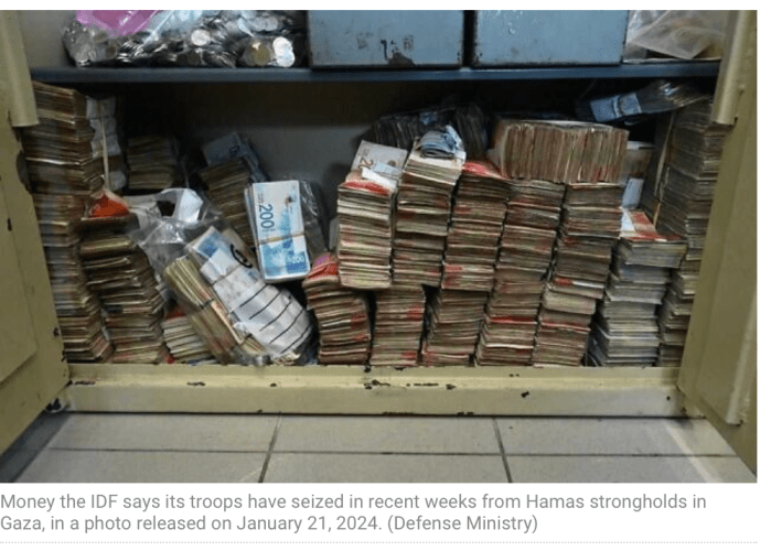 Das Verteidigungsministerium gab bekannt, dass die IDF während der letzten Wochen etwa NIS 15 Millionen, sowie US$ 1 Million und Gelder in irakischer, jordanischer und ägyptischer Währung gefunden haben. Die Gelder fanden sich in Hochburgen der Hamas, sie werden dem Verteidigungsministerium zur weiteren Verwendung zugeführt.