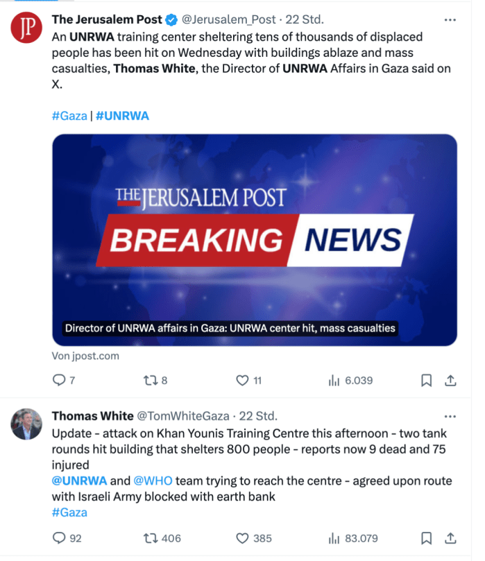 Thomas White, einer der leitenden Mitarbeiter der UNRWA in Gaza gab bekannt, dass die Zahl der Todesopfer nach dem Brand von gestern von neun auf 12 angestiegen ist. 15 Verletzte befänden sich in kritischem Zustand. In ersten Berichten hatte er gestern von ‘mehreren 10.000’ Flüchtlingen gesprochen, die in den Gebäuden Zuflucht gesucht hätten. So hatte das die Jerusalem Post weitergegeben. Das war eine Lüge! Kurz darauf korrigierte er selbst die Zahl auf 800 Flüchtlinge. Die Gebäude hätten nach einem Beschuss durch israelische Panzer Feuer gefangen. Er beschuldigte Israel nicht direkt, die Verantwortung für diesen Vorfall zu tragen, betonte aber, dass die IDF in den letzten Tagen ‘Operationen in der Region ausgeführt’ hätten. Seitens der IDF wurde betont, dass die Gebäude von der Hamas selbst beschossen worden seien. Das war ein Vorfall mit ‘friendly fire’ der Hamas.
