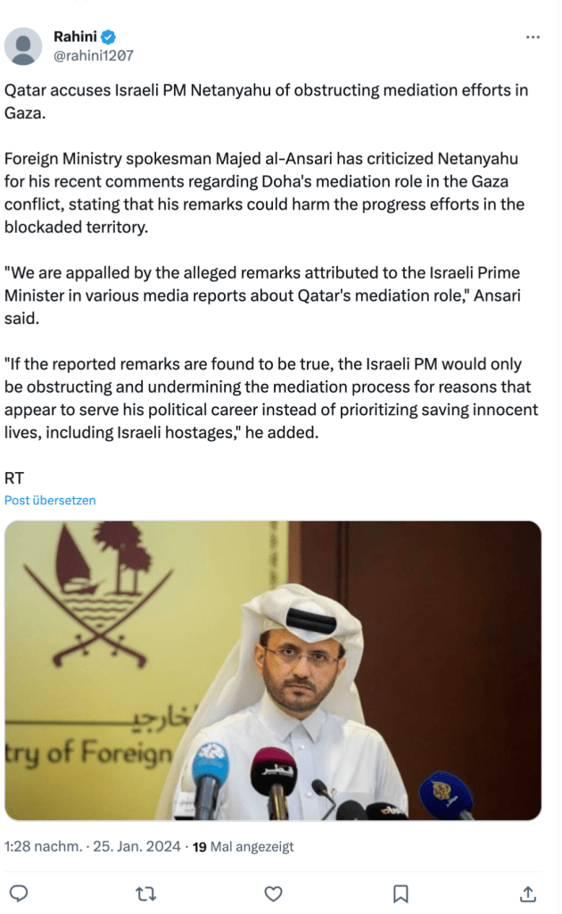 Minister Smotrich hat Katar bezichtigt, Israels Bemühungen, die Hamas zu eliminieren, zu untergraben. Katar kooperiere mit der Hamas Terror-Organisation, um den Krieg möglichst schnell zu beenden und die Geiseln weiter als Druckmittel zu behalten. Beides soll dazu beitragen, dass die Hamas nach wie vor die Herrschaft über den Gazastreifen behält. «Katar ist das grösste Hindernis für die Rückgabe der Geiseln. Wir könnten morgen alle 136 Geiseln bekommen, wenn Katar der Hamas ein Ultimatum stellen würde, alle Geiseln zurückzubringen, und wenn der Westen Katar ein Ultimatum stellen würde, dies zu tun.»