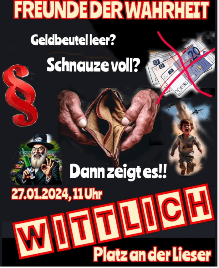Das Plakat bewirbt eine Veranstaltung, die heute in Wittlich stattfand. Veranstalter waren: «Die Freunde der Wahrheit, WIL» (Wittlich). Auf ihrer Facebook Seite schreiben sie: «Grund des Anstosses ist unsere Abbildung auf dem Flyer, welcher einen bärtigen Mann mit Spritze darstellt. Es wurde uns nahegelegt, dass hier evtl. ein antisemitischer Hintergrund besteht. Dies ist natürlich vollkommen an den Haaren herbeigezogen.» In ihrem Steckbrief geben sie an: «Wir hinterfragen, wir stellen klar, wir diskutieren, wir informieren, jeden 1. Sonntag im Monat.» Der 27. Januar ist nicht ‘der erste Sonntag im Monat’. Es ist ein Samstag und noch dazu der Holocaust-Gedenktag. Das ist kein Zufall. Im Zusammenhang mit dem Bild des orthodoxen Juden wird sehr schnell klar, dass die Veranstaltung zumindest in weiten Zügen antisemitisch ist. Die Kreisverwaltung Wittlich-Bernkastel arbeitete noch an einem ‘Auflagenbescheid’ und hat das Plakat zur Überprüfung an die Kriminalpolizei weitergeleitet. Die Ergebnisse der Untersuchungen sind mir noch nicht bekannt.