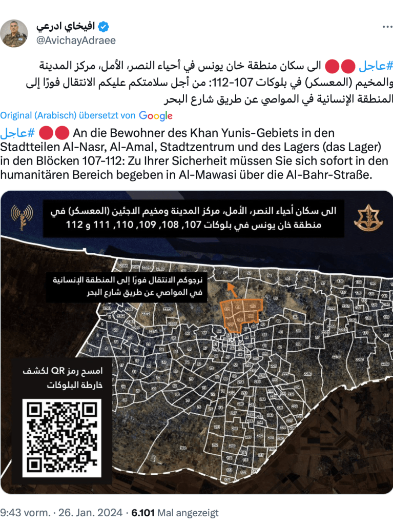 Gestern Vormittag forderte die IDF die Bevölkerung von einigen Gebieten in Khan Younis auf, ihre Wohnungen zu verlassen und in eine neu bezeichnete Region zu ziehen. Unter den zu evakuierenden Gebieten ist auch das Flüchtlingslager Khan Younis.
