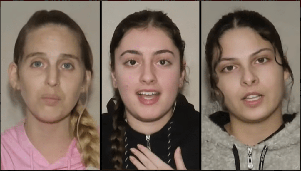Die Hamas veröffentlichte ein neues Video mit drei Geiseln, Karina Ariev, 19, Doron Steinbrecher, 30, und Daniela Gilboa, 19. Sie erklären, sich seit ‘107 Tagen in Geiselhaft zu befinden’, was den Rückschluss nahelegt, dass das Video vor sechs Tagen aufgenommen wurde. Über ihren Zustand wurde nichts berichtet, aber bitte schaut einmal die Augen an.