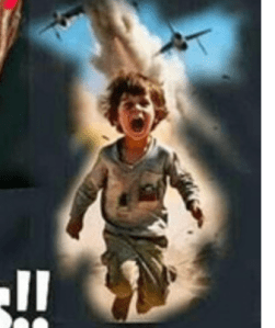 Ein weiteres Bild, das ein Kind zeigt, das vor Kampfjets versucht zu fliehen, ist ein offensichtlicher Versuch, Israel des Genozids nicht nur an Kindern in Gaza zu beschuldigen.