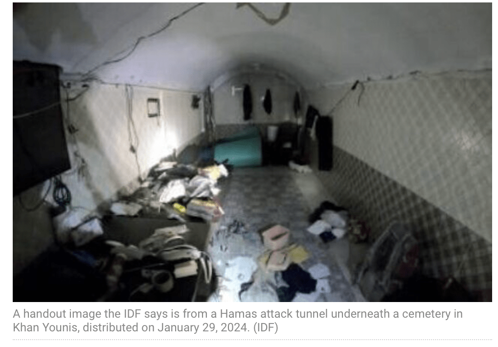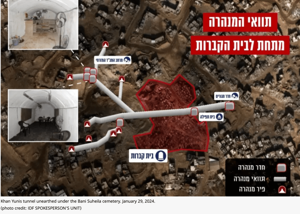 Unterhalb eines Friedhofs in Khan Younis entdeckte die IDF einen gut ausgebauten Tunnel, der u.a. dem Kommandanten der Terror-Brigade ‘Khan Younis’ als Einsatzzentrale gedient hatte, von wo aus er die Massaker vom 7. Oktober geleitet hat. Der Tunnel verfügte über fliessendes Wasser, Strom, Belüftungsanlagen und sogar eine gut ausgestattete Küche. In anderen Teilen des Tunnels befanden sich Besprechungsräume und Schlafräume für Anführer der Terror-Organisation. Einige Terroristen, die sich im Tunnel befanden, wurden eliminiert, die Tunnelanlage anschliessend zerstört.