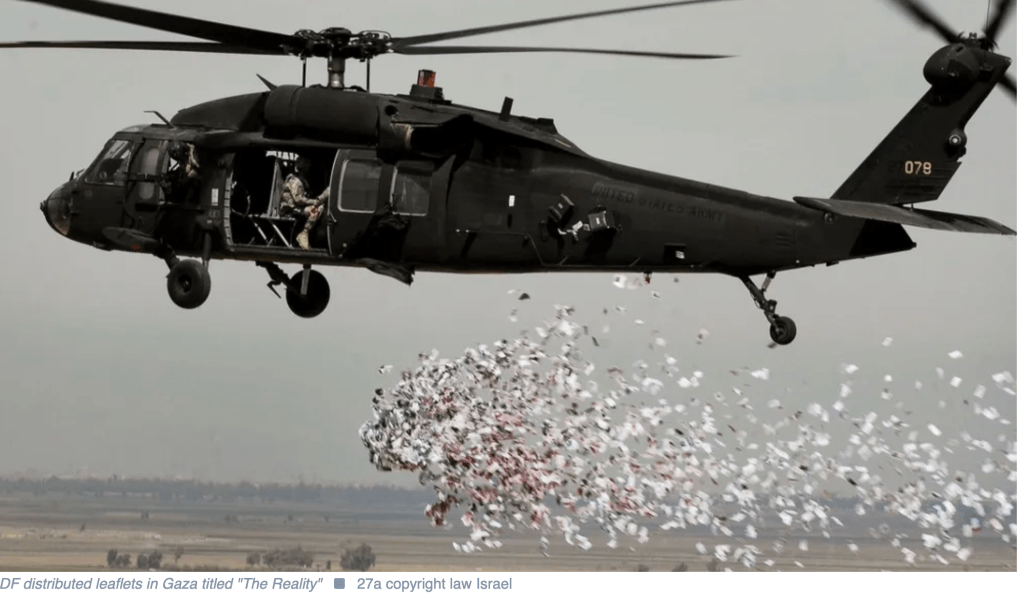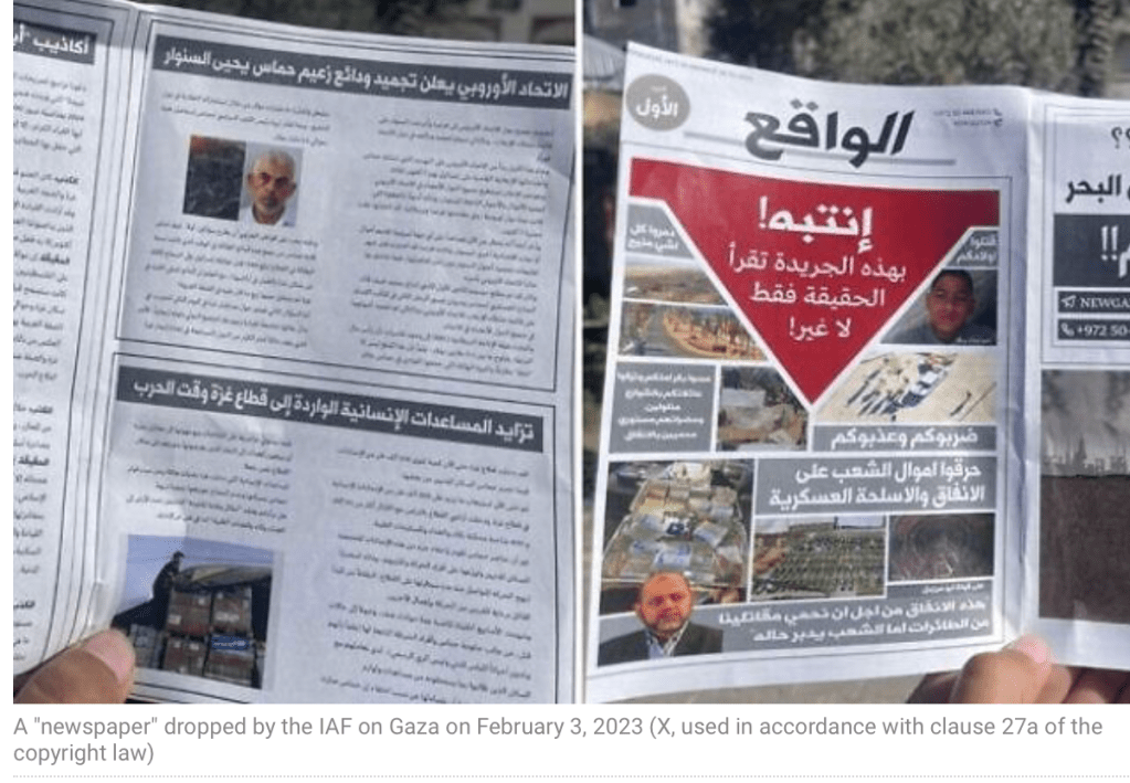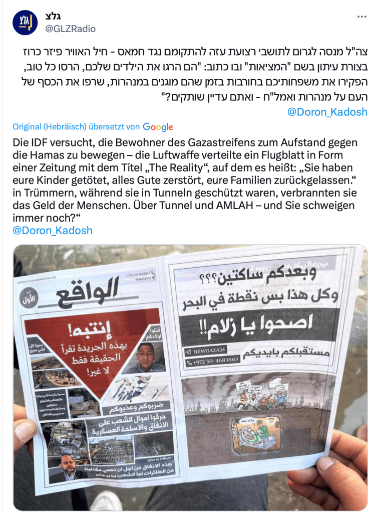 Die IAF hat eine Art ‘Zeitung’ mit Namen ‘The Reality’ über dem zentralen Gazastreifen abgeworfen. Das Blatt fordert die Bewohner auf, ‘aufzuwachen’ und eine neue Sichtweise auf die Hamas und andere Terror-Organisationen zu entwickeln. «Sie haben das Geld, das für euch bestimmt war, für Tunnel und Waffen verbrannt. Sie haben alles Gute zerstört, euch geschlagen und gefoltert, eure Kinder getötet, eure Familien auf der Strasse zurückgelassen, und sie verstecken sich in Tunneln. Und ihr seid immer noch still? All das ist nur ein Tropfen auf den heissen Stein. Eure Zukunft liegt in euren Händen.» Die Zeitung umfasst u.a. Berichte über Sanktionen der EU gegen Yahya Sinwar, Entgegnungen zu Anschuldigungen Israels durch Hamas-Sprecher Abu Obeida und die deutlich aufgestockte Zahl an Hilfsgüterlieferungen. Auch eine Warnung an die Hamas ist zu lesen: «Eure Zeit ist um!»