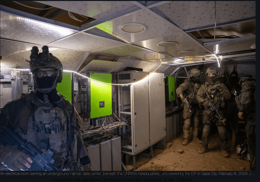 Unmittelbar neben dem Hauptquartier der UNWRA hat die IDF die bisher bedeutendste Infrastruktur der Hamas-Terror- Organisation entdeckt. Die Zentrale umfasst einen Elektroraum, professionelle IT-Anlagen, ein Serverraum für moderne PC-Systeme, Wohn- und Aufenthaltsräume, Küchen und Sanitäranlagen. Durch den Ort unterhalb des UNRWA-Zentrums galt der dafür gewählte Ort als sehr sicher und geschützt vor Angriffen. Das Hauptquartier befindet sich im beliebten Vorort Rimal von Gaza City, einem Ort, der als bereits gereinigt und erobert galt. Zum Zeitpunkt der Kämpfe um Gaza City war der Ort noch unbekannt, mittlerweile habe es genügend geheimdienstliche Informationen, um dort erneut mit der Suche zu beginnen. «Wir hatten eine Informationsbasis, aber nicht genug, um 20 Meter tief zu graben und den Tunnel zu finden, wir brauchten etwas mehr. Wir haben Informationen von Gefangenen, die wir gefangen nehmen, von Computern, die wir finden, von Dokumenten und Karten.» Philippe Lazzarini, CEO der UNRWA, beteuerte gestern Abend, nichts von den Aktivitäten der Hamas direkt unter ‘seinem Haus’ gewusst zu haben. Die UNRWA hatte, laut seiner Aussage, bereits am 12. Oktober den Gazastreifen verlassen. «Wir haben die Gebäude seither nicht mehr genutzt und haben deshalb auch keine Informationen mehr über irgendwelche unterirdischen Aktivitäten.» Ein im Hof des Gebäudekomplexes aufgefundener Tunneleinstieg wurde sicher nicht erst nach dem 12. Oktober gebaut, er muss mit schweigender Billigung der UNRWA schon lange vorher dort gewesen sein. Die neuentdeckte Infrastruktur lässt erneut Befürchtungen aufkommen, dass die Infiltration der UNRWA durch die Hamas noch deutlich höher ist, als bisher vermutet. Der israelische Botschafter zur UNO, Gilad Erdan twitterte gestern in Richtung Lazzarini «@UNLazzarini es ist nicht so, dass Sie es nicht wussten, es ist so, dass Sie es nicht wissen WOLLTEN. Wir haben Terrortunnel unter UNRWA-Schulen aufgedeckt und Beweise dafür geliefert, dass die Hamas die UNRWA ausnutzt. Wir haben gebeten, eine umfassende Durchsuchung aller UNRWA-Einrichtungen in Gaza durchzuführen. Aber Sie haben sich nicht nur geweigert, sondern auch den Kopf in den Sand gesteckt. Übernehmen Sie die Verantwortung und treten noch heute zurück! Jeden Tag finden wir weitere Beweise dafür, dass in Gaza die UN = Hamas ist und umgekehrt. Allem, was die UN über Gaza sagt oder behauptet, kann man nicht trauen.»