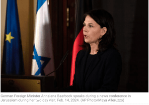 Die deutsche Aussenministerin Annalena Baerbock, im Inland oft aus nicht nachvollziehbaren Gründen geschmäht, entwickelt sich immer mehr zu einer hervorragenden Nachfolgerin von ehemaligen deutschen Aussenministern. Bei ihrem derzeitigen siebten Besuch in Israel seit Beginn des Krieges, verlangte sie, ebenso wie Frankreich, die USA und GB, nachhaltige Sanktionen gegen extremistische Siedler in Judäa und Samaria einzuführen. Diese Siedler griffen in den letzten Monaten immer wieder grundlos palästinensische Farmer an. Sie betonte, dass die EU bei diesen Forderungen als Ganzes eine Meinung vertreten müssen. Gleichzeitig warnte sie aber auch vor einer militärischen Offensive auf Rafah. «1.3 Millionen Menschen leben dort derzeit auf sehr kleinem Raum. Sie haben keine Ahnung, wohin sie noch ausweichen können. Wenn Israel unter diesen Umständen angreift, wird es zweifelsfrei zu einer Katastrophe kommen.»