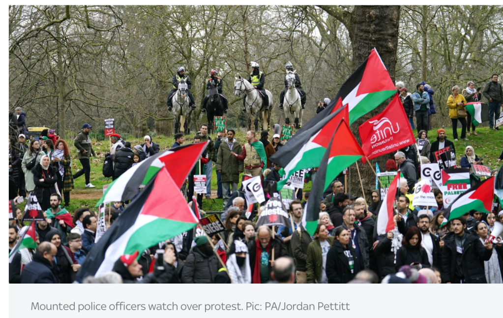Mit Rücksichtnahme auf die Gottesdienste in den Synagogen rund um den Marble Arch am Hyde Park wurde der Beginn der Demonstration von 12:30 auf 13:30 verschoben. 1.500 Polizisten werden für die Sicherheit sorgen. Kommandant Kyle Gordon betonte, dass bisher alle Demonstrationen seit dem 7. Oktober friedlich verlaufen seien und forderte alle Teilnehmer auf, sich auch heute wieder entsprechend zu verhalten. Die Route führt mit einem Sicherheitsabstand in der Nähe der israelischen Botschaft vorbei entlang der Park Lane und wird am südlichen Ende des Hyde Parks enden. Die dort geplanten Reden müssen bis 17 Uhr beendet, die Demonstration bis 18 Uhr aufgelöst sein. Nach Zeitungsberichten nehmen derzeit zwischen 200 – 250.000 Personen teil. Obwohl sie bisher ‘friedlich’ verlief, wurden bereits 10 Personen festgenommen.