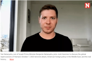 Yair Netanyahu, das enfant terrible und Spross der zukünftigen Regenten-Dynastie, mit Sitz in Florida, hat sich wieder zu Wort gemeldet. «Dieser Krieg ist nicht nur ein Krieg Israel gegen Gaza, es ist der Krieg Iran und Gaza gegen Israel.» erklärte er in einem Interview mit Josh Hammer in Newsweek. Das Interview trägt den Titel: «The Real History of Israel and Palestine» und kann hier angeschaut werden.