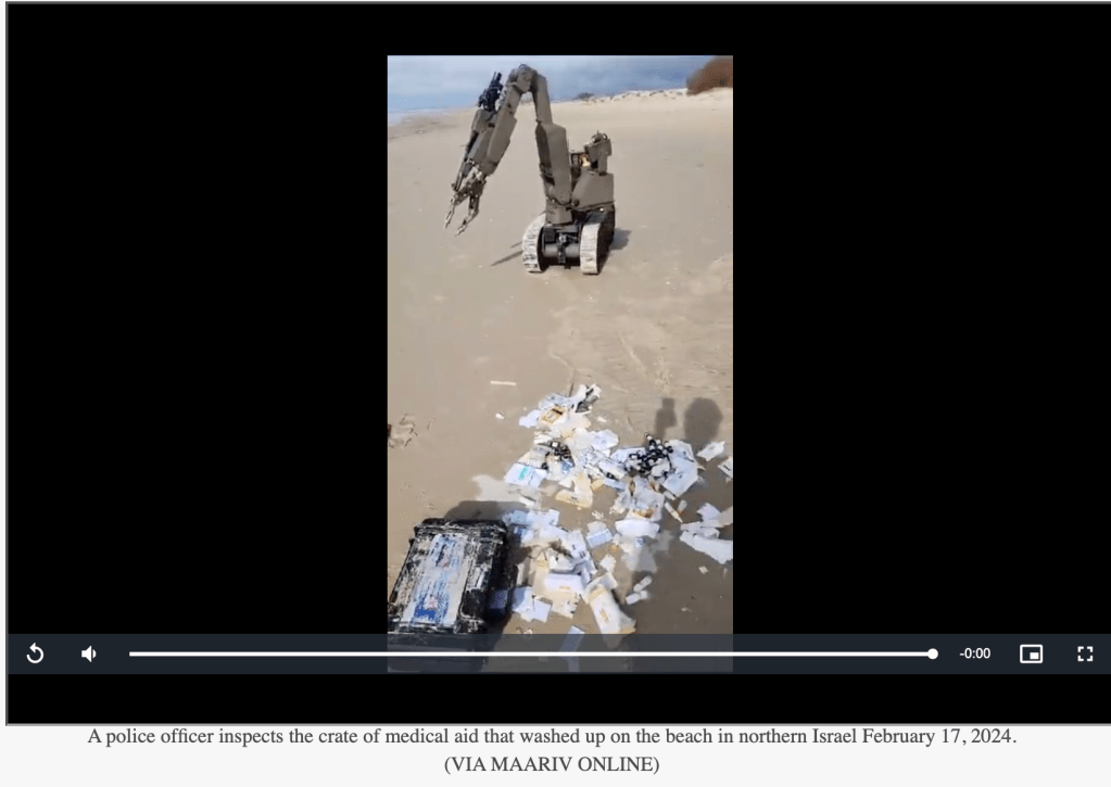 Heute wurde ein seltsamer Fund am Strand vom Kibbutz Ma’agan Michael in der Nähe von Caesarea angeschwemmt. Es war eine Kiste mit Medikamenten und anderen Hilfsgütern, die offensichtlich für den Gazastreifen bestimmt war und aus Jordanien stammte. Polizisten aus dem benachbarten Zichron Ya’akov ordneten die Untersuchung mit einem Spezialgerät an, um möglichen Sprengstoff aufzuspüren und zu entfernen. Eine Massnahme, die bei verdächtigen Funden immer getroffen wird. In diesem Fall erwies sich die Box als harmlos. Auf der Box ist ein Zettel angebracht, auf dem steht: «Von Jordanien nach Gaza». Welchen abenteuerlichen Weg die Box hinter sich hat, wird wahrscheinlich für immer ein Rätsel bleiben.