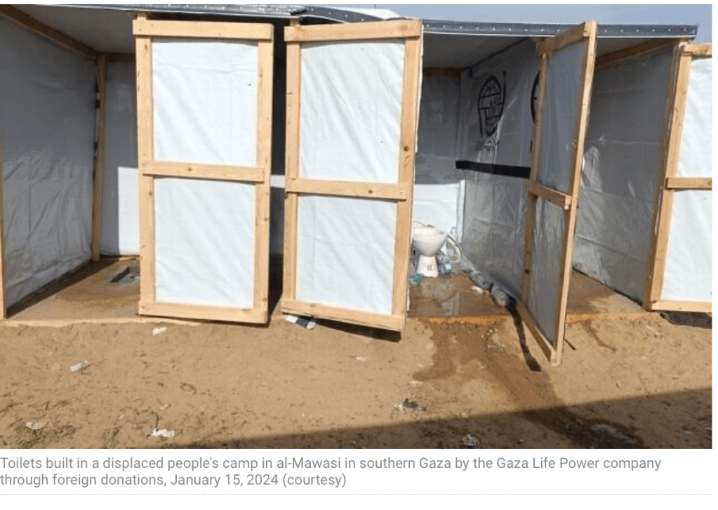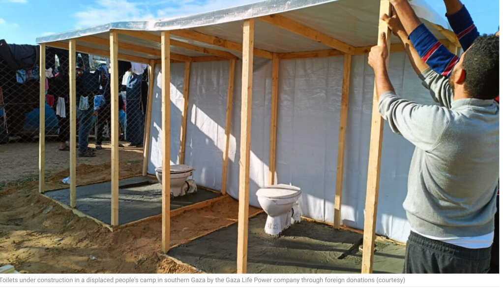 Die beiden Frauen haben nach Lösungsmöglichkeiten gesucht, wie sie helfen können, ohne erst Materialen aus dem Ausland beziehen zu müssen. Sie wurden in Gaza fündig. Alles, was sie brauchten, um die entsprechenden Sanitäranlagen zu bauen, ist bereits in den Baumärkten vorhanden, nur gab es keine Käufer. Mit den gesammelten Spenden kauften sie alles auf, was der Markt hergab. Die Toiletten entsprechen, wenn auch mit einfachsten Mitteln konstruiert, durchaus einem zeitgemässen Standard. Und, das ist nicht selbstverständlich, sie sind ans Abwassersystem angeschlossen. Die Kosten für eine Kabine liegen etwa bei US$ 440. Arbeitskosten entstehen keine, alle arbeiten auf freiwilliger Basis.