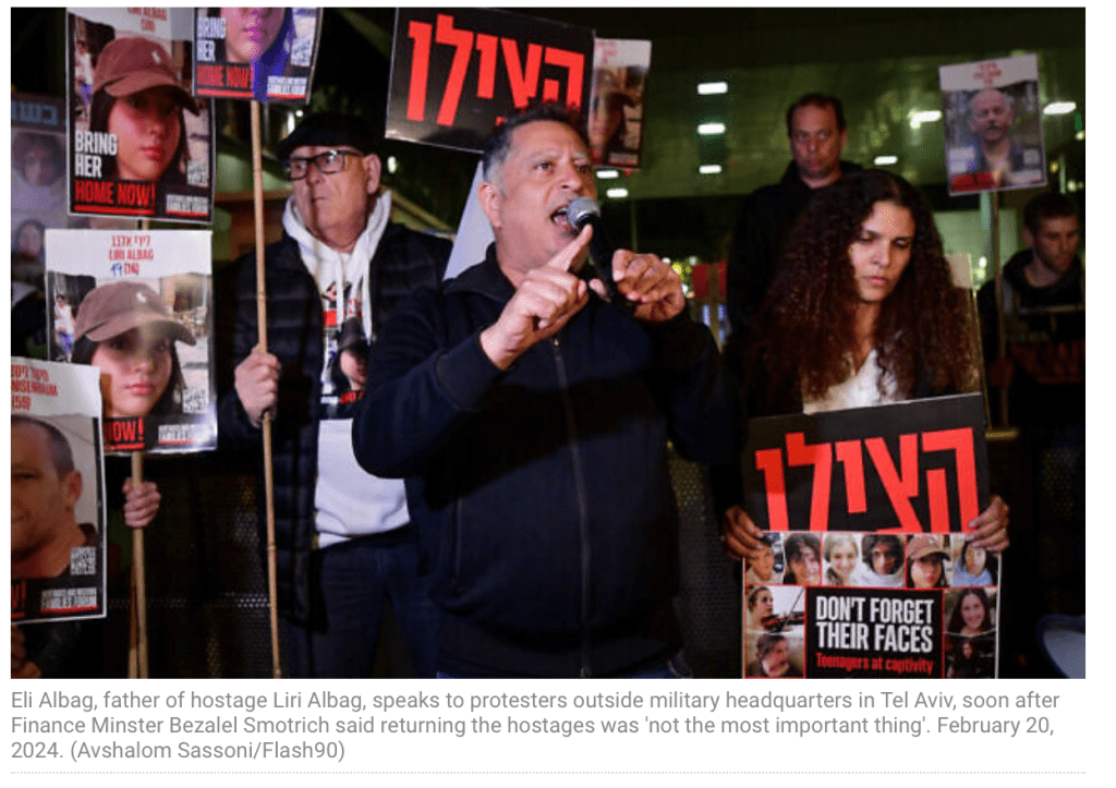 Eli Albag, der Vater der 18 Jahre alten Liri, die immer noch im Gazastreifen festgehalten wird, zeigte sich auch im Namen der anderen empört: «Herr Smotrich, lassen Ihre Kinder betroffen sein, und ich werde auf der Strasse stehen und schreien: ‘Das ist nicht das Wichtigste’. Ich sage dem Volk Israel: Wer auch immer denkt, die Geiseln seien nicht wichtig, lasst sie eure Kinder als Geiseln nehmen, dann könnt ihr reden. Denn wir leiden seit 137 Tagen, jeden Tag, jede Minute. Wir schlafen nachts nicht.»