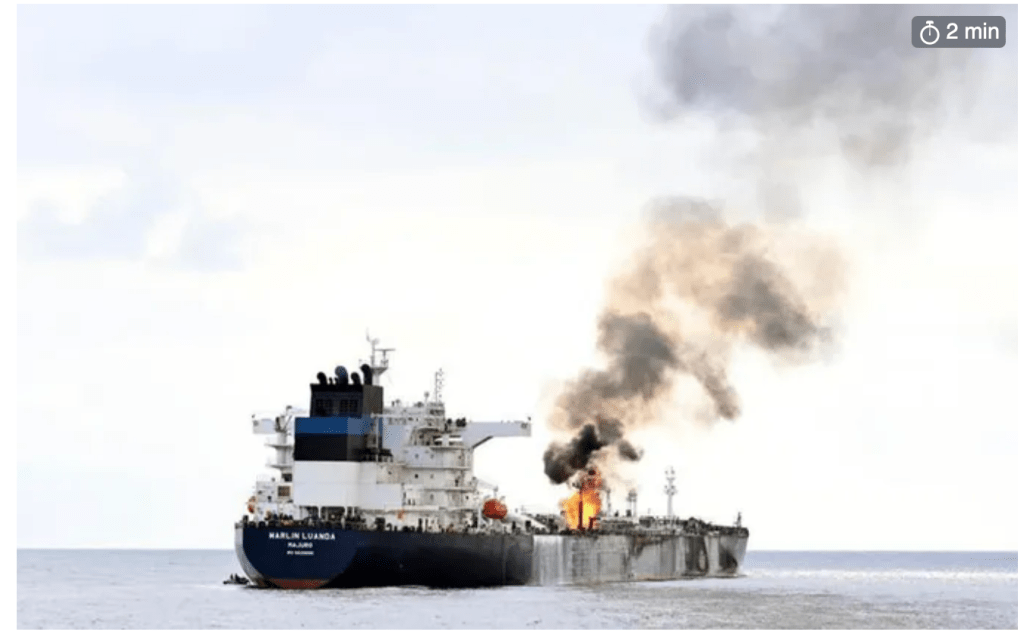 Die Rubymar, das Frachtschiff, welches am vergangenen Sonntag von Raketen der Houthi-Rebellen manövrierunfähig geschossen wurde, scheint doch noch nicht zu sinken. Kurz nach dem Beschuss wurde die Mannschaft nach Djibouti evakuiert. Das Schiff liegt im Golf von Aden vor Anker. Es läuft langsam mit Wasser voll und zieht bei den trotz des Ankers möglichen Bewegungen mittlerweile eine riesige Ölspur hinter sich her, wie Satellitenbilder zeigen. Das Schiff, das mit 41.000 Tonnen brennbarem Dünger beladen ist, soll so bald als möglich nach Djibouti geschleppt werden. Der Ölteppich wird sich in den kommenden Tagen noch vergrössern und eine noch nicht abzuschätzende Umweltkatastrophe auslösen.