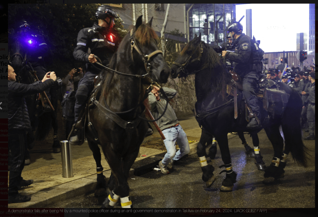 Die Demonstranten auf dem ‘Democracy Square’ nahe dem Militärhauptquartier stellten sich der Polizei entgegen. Die versuchte zunächst mit dem Einsatz von Wasserwerfern die Demonstranten daran zu hindern, wie so oft den Ayalon, die wichtigste Nord-Süd Verbindung, zu blockieren. Wasserwerfer sind meist harmlos, gerät man, das weiss ich aus eigener Erfahrung genau in den Strahl, gibt es schon mal blaue Flecken, aber mehr passiert nicht. Hingegen hat der rücksichtlose Einsatz von Polizeipferden schmerzhafte Folgen. Auf dem nachfolgenden Video ist zu sehen, wie brutal die Polizei gegen harmlose Demonstranten vorgeht. Zehn Personen wurden durch die kräftigen Tiere einfach umgeworfen, einige Menschen wurden gegen eine Mauer gepresst. Ein Polizist schlug mit dem Zügel so heftig auf den Kopf eines Mannes, dass der verletzt zu Boden ging, während der Polizist einfach weiterritt. Zwischenzeitlich wurde eine Untersuchung des Vorfalls eingeleitet. Oppositionsführer Lapid zeigte sich entsetzt: «Das gewaltsame Vorgehen der Polizei heute Abend gegen Demonstranten, darunter Familien der Geiseln, ist gefährlich, antidemokratisch und darf so nicht weitergehen. Das Recht zu protestieren ist ein Grundrecht, und es kann den Demonstranten nicht mit Schlagstöcken und Wasserwerfern genommen werden.» Obwohl die Demonstration bewilligt war, argumentierte die Polizei, die 21 Festnahmen seien erfolgt, weil «die Demonstranten sich illegal auf der Strasse versammelt und den Frieden gestört haben.»
