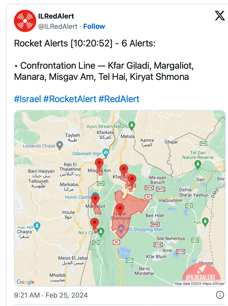 Auch an der Nordgrenze des Landes gehen die Kämpfe unvermindert weiter. Bereits zweimal wurden am heutigen Vormittag die Alarme ausgelöst. Mindestens vier Raketen fielen in unbebautem Gebiet auf offenes Feld in der Nähe von Margaliot. Früher am Vormittag hatte es schon einen weiteren Serienbeschuss gegeben, der die Alarme entlang der Grenze zum Libanon auslöste. Bei einem sofort gestarteten Rückschlag wurde ein LKW in der Nähe von Qusayr, einer israelisch-libanesischen Grenzstadt getroffen. Zwei Hisbollah-Terroristen kamen bei diesem Angriff ums Leben.