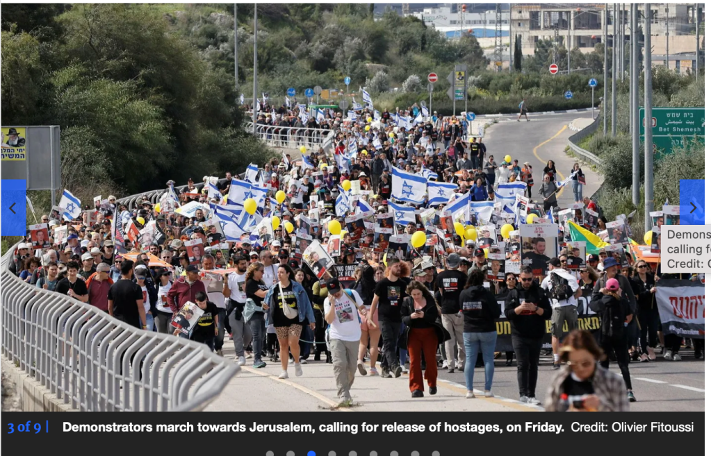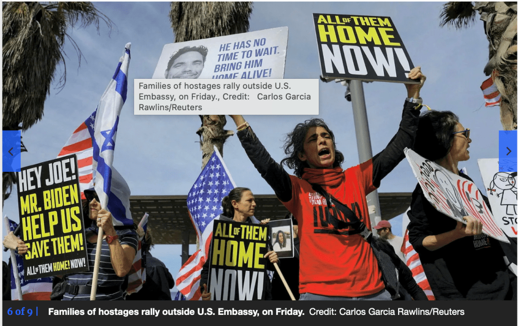 Familien und Freunde von noch im Gazastreifen festgehaltenen israelischen Geiseln halten derzeit eine Demonstration ausserhalb der Zweigstelle der US-amerikanischen Botschaft in Tel Aviv ab. Sie fordern die US-amerikanische Regierung und Präsident Joe Biden dazu auf, Druck auf die israelische Regierung auszuüben. Die soll endlich einer neuen Vereinbarung zur Freilassung der Geiseln zustimmen und nicht, wie bisher, sie mit immer neuen Bedingungen verzögern. Sprecher der Demonstranten betonten, dass die US-amerikanische Regierung bisher mehr für sie unternommen hat, als die israelische. «Wir wissen, dass der Weg zur Rückgabe der Geiseln in einem verantwortungsvollen Abkommen, das die Sicherheit des Landes und der gesamten Region wiederherstellt, über die US-Regierung mit Präsident Biden an der Spitze führt.»
