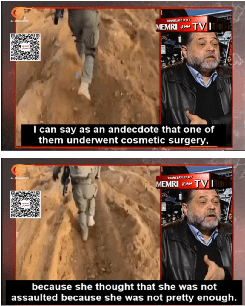 Die Perversion der Lügen kennt keine Grenzen! Osama Hamda, hochrangiger Hamas-Anführer, erklärte in einem Interview des libanesischen TV-Senders Mayadeen, dass mindestens eine, wahrscheinlich aber mehrere freigelassene Geiseln sich in Israel Schönheitsoperationen unterzogen hätten. Zu hören ist die unglaubliche Aussage im Video der MEMRI Webseite ab 1:16. Hier auch die entsprechenden Screenshots.