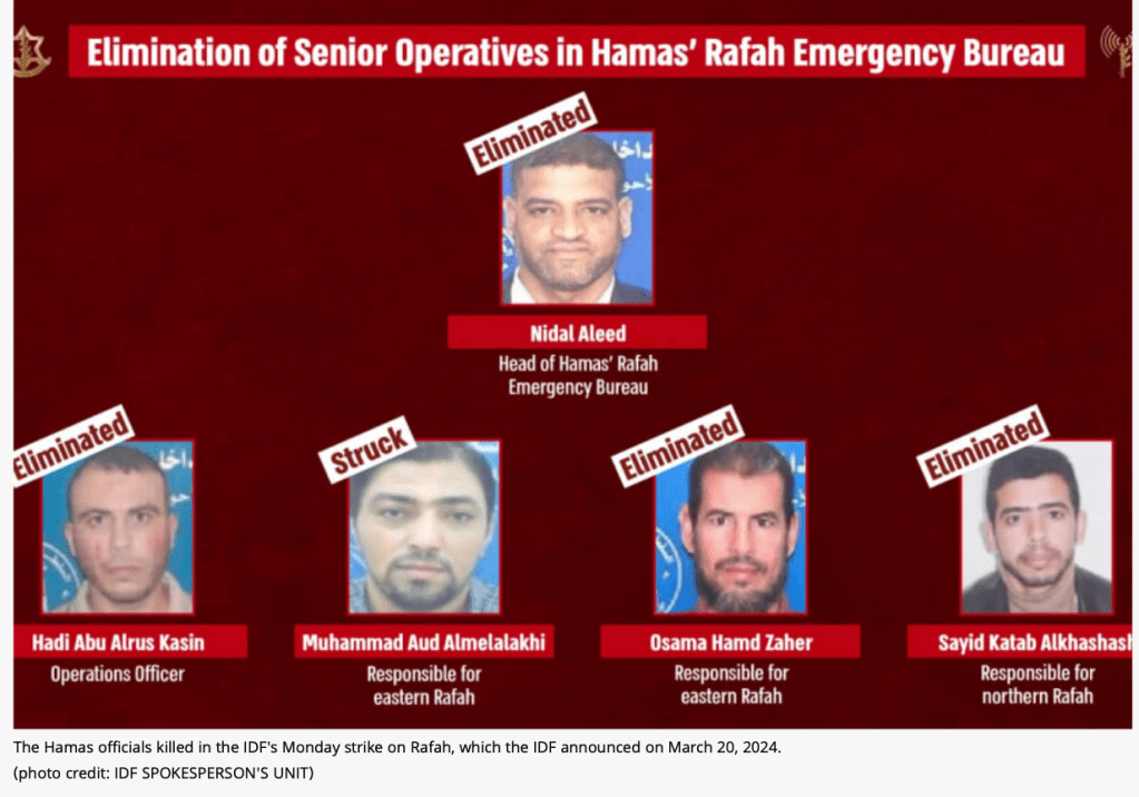 Kampfflugzeuge der IAF konnten bereits am Montag fünf hochrangige Hamas-Anführer in Rafah eliminieren. Die IAF flog ihre gezielten Angriffe in Zusammenarbeit mit dem Shin Bet und der IDF. Die fünf waren verantwortlich für Hamas-Aktivitäten innerhalb der humanitären Schutzzonen und koordinierten Angriffe der Terroristen. Bereits in der vergangenen Woche war der Chef des Notfallbüros der Hamas in Rafah, Nidal Aleed, getötet worden.