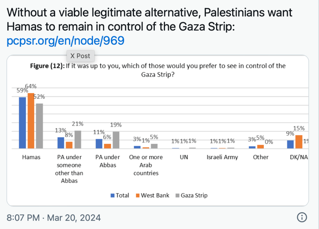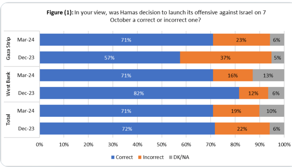 Neueste Umfragen unter der Bevölkerung des Gazastreifens zeigen, dass die Zahl der Befürworter einer Zwei-Staaten-Lösung stark ansteigt und die Zahl derer, die Gewalt als einzig richtigen Weg zur Gründung eines palästinensischen Staates deutlich abnimmt. Dennoch bezeichnen mehr Befragte das Massaker vom 7. Oktober als positiv. 52% wollen, dass die Hamas nach dem Krieg weiterhin Gaza regiert, gegenüber nur 38% im Dezember. Was signifikant gesunken ist, ist die Unterstützung der Hamas, sowohl in den Gebieten von Judäa und Samaria, als auch im Gazastreifen. Die Ergebnisse sind allerdings nicht überall so, dass sie als signifikant gewertet werden können. Die Zahlen reflektieren in keiner Weise, dass der Verursacher des Krieges die Hamas war und somit das Leiden der Zivilisten auch verantworten hat.