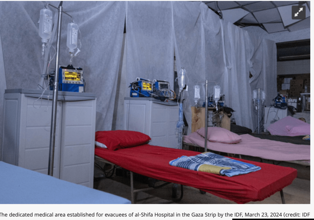Die gute Nachricht des Tages: Mitten im Gebiet des Shifa-Spitalshat die IDF ein Feldlazarett eingerichtet. Die dazu notwendige Ausrüstung, sowie medizinische Teams wurden vor Ort gebracht. Mit der Inbetriebnahme des Feldlazaretts soll die medizinische Betreuung von Zivilisten verbessert werden, die aus militärischer Notwendigkeit evakuiert wurden. Trotz der intensiven Bemühungen der IDF, die Terroristen, die sich im Spital verschanzt haben aufzustöbern und zu eliminieren, tut die IDF alles, um Schäden an Patienten, medizinischen Mitarbeitern und medizinischer Ausrüstung zu minimieren. Am Freitag wurden von der Koordinations- und Verbindungsbehörde für den Gazastreifen (COGAT) vermehrt LKWs mit medizinischer Ausrüstung, Wasser, Lebensmitteln und Medikamenten in das Spital geliefert. Zu den Ausrüstungsgegenständen gehören auch moderne Überwachungsgeräte.