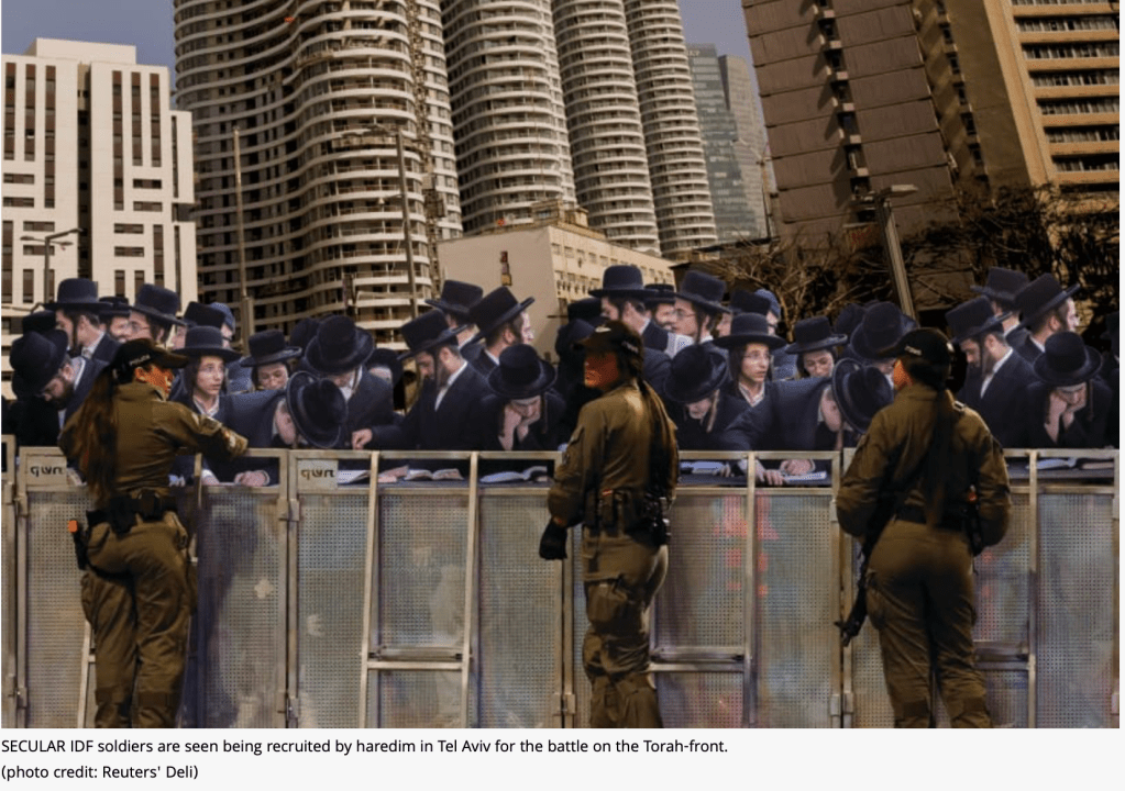 - Hunderte von haredischen Männern haben heute in Bnei Brak demonstriert, um zu fordern, dass säkulare israelische Juden einen Teil der Last mittragen, die sie mit dem Studium der religiösen Texte tragen. Bisher war es den Säkularen erlaubt, das Torahstudium zu vermeiden, indem sie sich zur IDF meldeten.