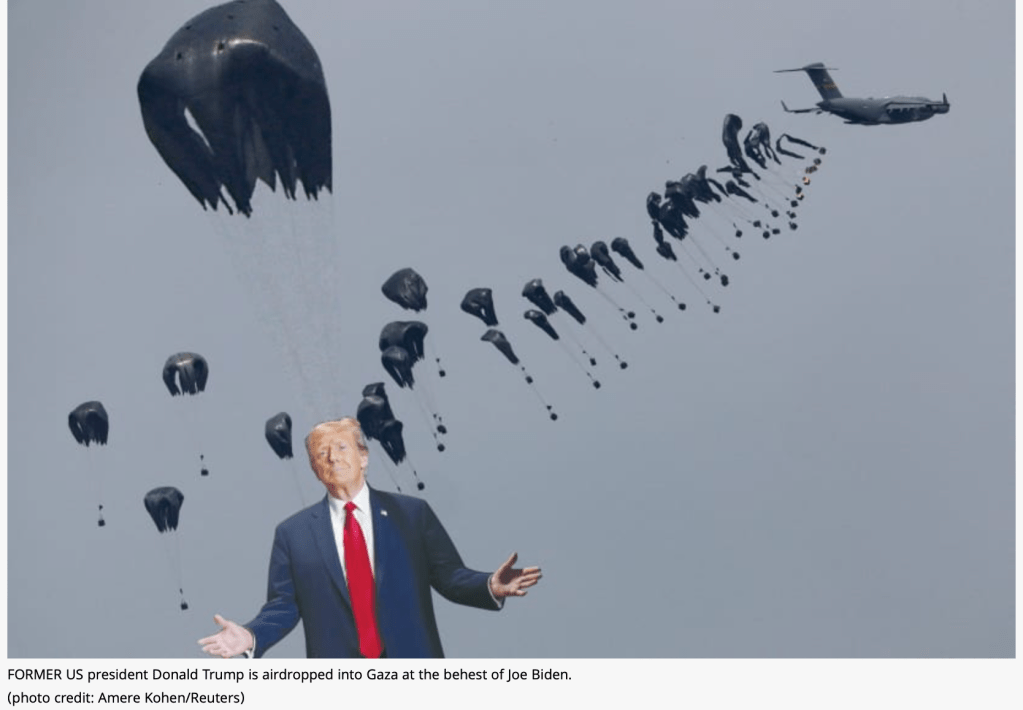 - Nachdem die humanitäre Luftbrücke nach Gaza auch für die USA problemlos angelaufen ist, haben US-Präsident Joe Biden und Netanyahu einen Weg gefunden, wie sie das angespannte Verhältnis zwischen ihren Staaten verbessern können. Biden hat dazu in der vergangenen Woche eine Verfügung erlassen, dass Donald Trump nach Gaza eingeflogen wird, um dort eine Einigung zwischen Israel und der Hamas zu erreichen. Einige Stunden vor dem geplanten Absprung über Gaza City warnen Flugblätter davor, dass ein Zusammenprall mit dem schwergewichtigen Mann tödlich sein kann. Die Bevölkerung wird gebeten, in der geplanten Zeit die Häuser nicht zu verlassen.
