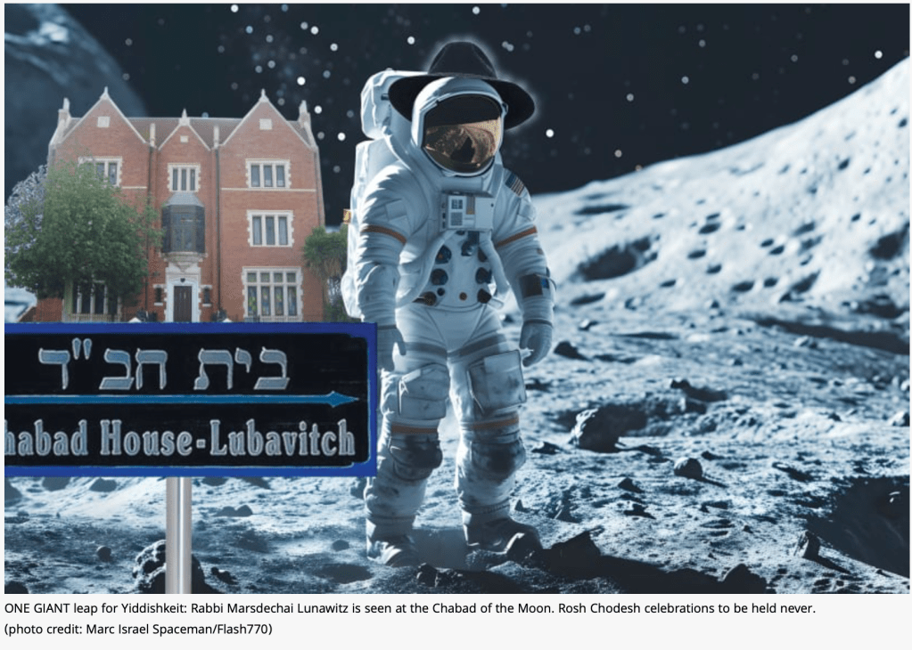- Die Chabad-Lubavitcher Bewegung hat es als erste jüdische Gemeinschaft geschafft, eine Synagoge und ein Zentrum auf dem Mond zu eröffnen. «Ein kleiner Schritt für die Menschheit, aber ein grosser Schritt für die Jiddishkeit.» betonte Rabbi Marsdechai Lunawitz, als er die Türen der Synagoge im ‘Meer der Stille’ öffnete.