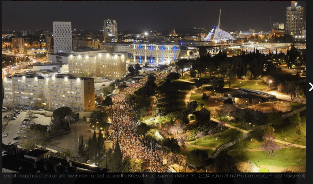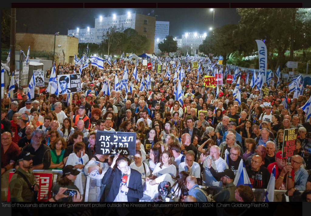 Gestern Abend haben sich mehr als 100.000 Demonstranten in Jerusalem zum grössten Protest seit dem 7. Oktober versammelt. Diese Grossveranstaltung gegenüber der Knesset markiert sechs Monate seit dem Massaker vom 7. Oktober. Gleichzeitig fanden in der ganzen Stadt mehrere kleine Veranstaltungen statt. Moshe Radman, der Sprecher von ‘Brothers in Arms’ betont, dass die Regierung von Netanyahu nicht die israelische Öffentlichkeit vertritt und fordert die Knesset auf, ihre geplante Frühlingspause dringend zu verschieben. «Erstens wollen wir Wahlen, weil wir denken, dass diese Regierung die Öffentlichkeit nicht vertritt, und zweitens denken wir, dass es kein guter Zeitpunkt ist, eine Pause einzulegen, wenn die Geiseln noch im Gazastreifen sind. Alle drei Tage stirbt eine Geisel. Sie werden für 42 Tage weggehen. Das bedeutet, dass 14 Geiseln sterben werden.»