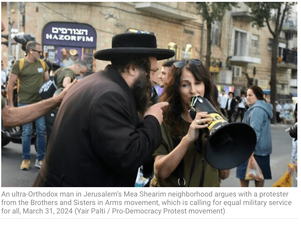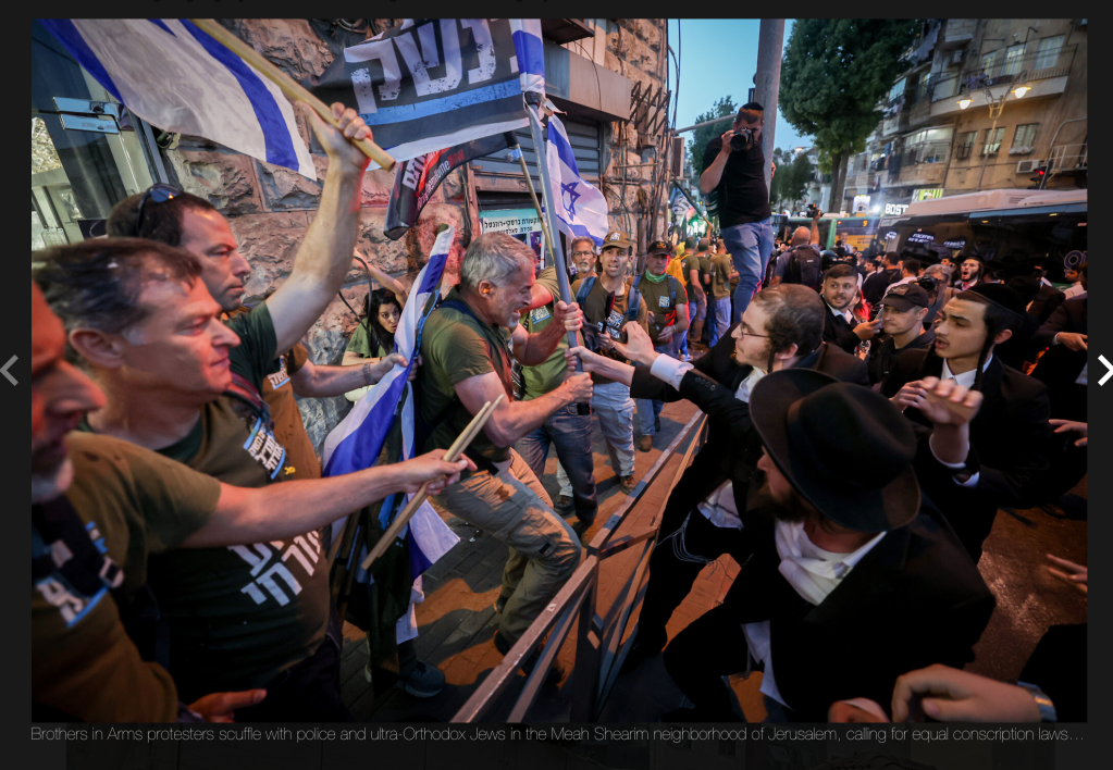 Zu unangenehmen Auseinandersetzungen kam es gestern Abend zwischen haredischen Jugendlichen und Mitgliedern der Reservisten-Vereinigung ‘Brothers in Arms’ in Mea Shearim. Nachdem ein Jugendlicher eine israelische Fahne in Brand gesetzt hatte, flogen Eier auf die säkularen Demonstranten, die gegen die Ungleichbehandlung bei Militärdienst beklagten. Weiterhin kam es zu teils sehr handgreiflichen Zwischenfällen. Schliesslich wandte sich ein Mitglied von ‘Brothers in Arms’ in Jiddish an die Haredim: «Sagt euren Rabbinern, dass es genug ist, wir alle sollen Teil des jüdischen Volkes im Staat Israel sein. Wir brauchen euch, um der Armee beizutreten, wir können euch nicht auf dem Rücken tragen. Wir wollen die Last gleichmässig verteilen. Was in der Vergangenheit war, kann so nicht weitergehen.» Jiddish ist die Alltagssprache in Mea Shearim, einem ultra-orthodoxen Stadtviertel von Jerusalem.