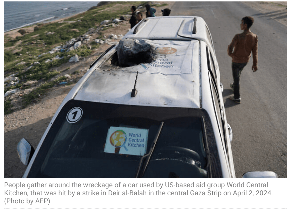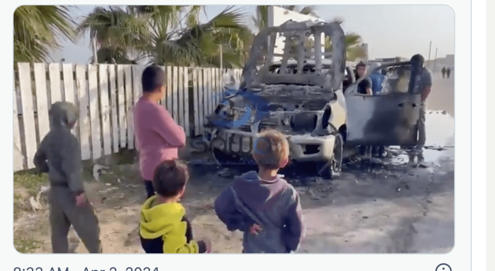In der Nacht von gestern auf heute kam es in Gaza zu einem furchtbaren, irrtümlichen Angriff der IAF. Wie die NGO ‘World Central Kitchen’ (WCK) am Morgen bestätigte, kamen sieben Mitarbeiter bei ihrem Einsatz im Norden des Gazastreifens ums Leben. Ihre zwei gepanzerten Fahrzeuge, deutlich markiert als Teil der Hilfsorganisation, waren beladen mit Lebensmitteln und Hilfsgütern, die sie im nördlichen Teil des Gazastreifens verteilen wollten. Ein von palästinensischen Medien verbreitetes Video zeigt ein Fahrzeug mit einem Einschlag in Höhe des Beifahrersitzes und ein zweites, völlig ausgebranntes Fahrzeug.