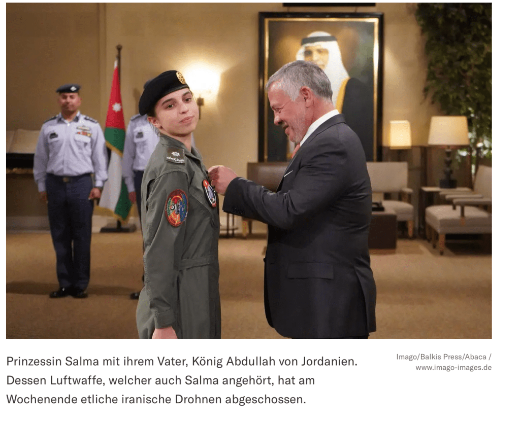 Prinzessin Salma bint Abdulla von Jordanien, die jüngste Tochter von König Abdullah II, hat beim Angriff durch den Iran auf Israel selbst einige Drohnen mit ihrem Kampfjet abgeschossen. Die junge Dame, 23 Jahre alt, ist bereits seit 2018 Absolventin der britischen Militärakademie Sandhurst und seit 2020 Kampfpilotin in der Royal Air Force. Ebenso wie ihr Vater und ihr älterer Bruder Hussein, 29, nahm sie mehrfach an Flügen teil, mit denen Hilfsgüter und Lebensmittel über Gaza abgeworfen wurden. Die Beziehungen zwischen Israel und Jordanien haben sich in den vergangenen Monaten verschlechtert, was grossteils der rigiden Haltung Netanyahus gegenüber den Palästinensern geschuldet ist. Seit 1994 verbindet die beiden Staaten ein Friedensvertrag. Doch der ist fragil. Und das nicht nur wegen der Palästinenser.