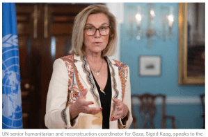 Sigrid Kaag, die UN-Koordinatorin für humanitäre Hilfe und Wiederaufbau im Gazastreifen, lobt Israel dafür, Schritte in die richtige Richtung unternommen zu haben, um die Menge der Hilfslieferungen nach Gaza zu erhöhen. Es müsse jedoch Sorge getragen werden, dass ‘Qualität und Quantität’ der Lieferungen weiter verbessert und auf einem hohen Niveau weiterführt werden. Nur so könne sichergestellt werden, dass bald Projekte in Vorbereitung für den baldigen Wiederaufbau im Gazastreifen begonnen werden können. Gemeinsam mit ihrem Team hat sie, so informiert sie weiter, einen vereinfachten Landkorridor von Jordanien in den Gazastreifen vorbereitet, über den, zusammen mit Rafah und Kerem Shalom, die Lieferungen erleichtert werden sollen. Sie bezeichnete die Kooperation mit Israel als sehr erfolgreich. Dringend notwendig seien aber verbesserte Ausrüstungen, wie gepanzerte Fahrzeuge, bessere Kommunikationsmittel, und eine nachhaltige Verbesserung der Infrastruktur.